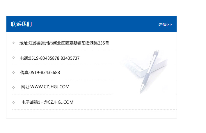 地址:常州市新北區友邦商務大廈1幢16、17層  電話:0519-85101652  傳真:0519-85112595  郵編:213022  網址:www.cz-jiayue_cn.chinaxxhb.com  郵箱:xiajifengaa@163.com